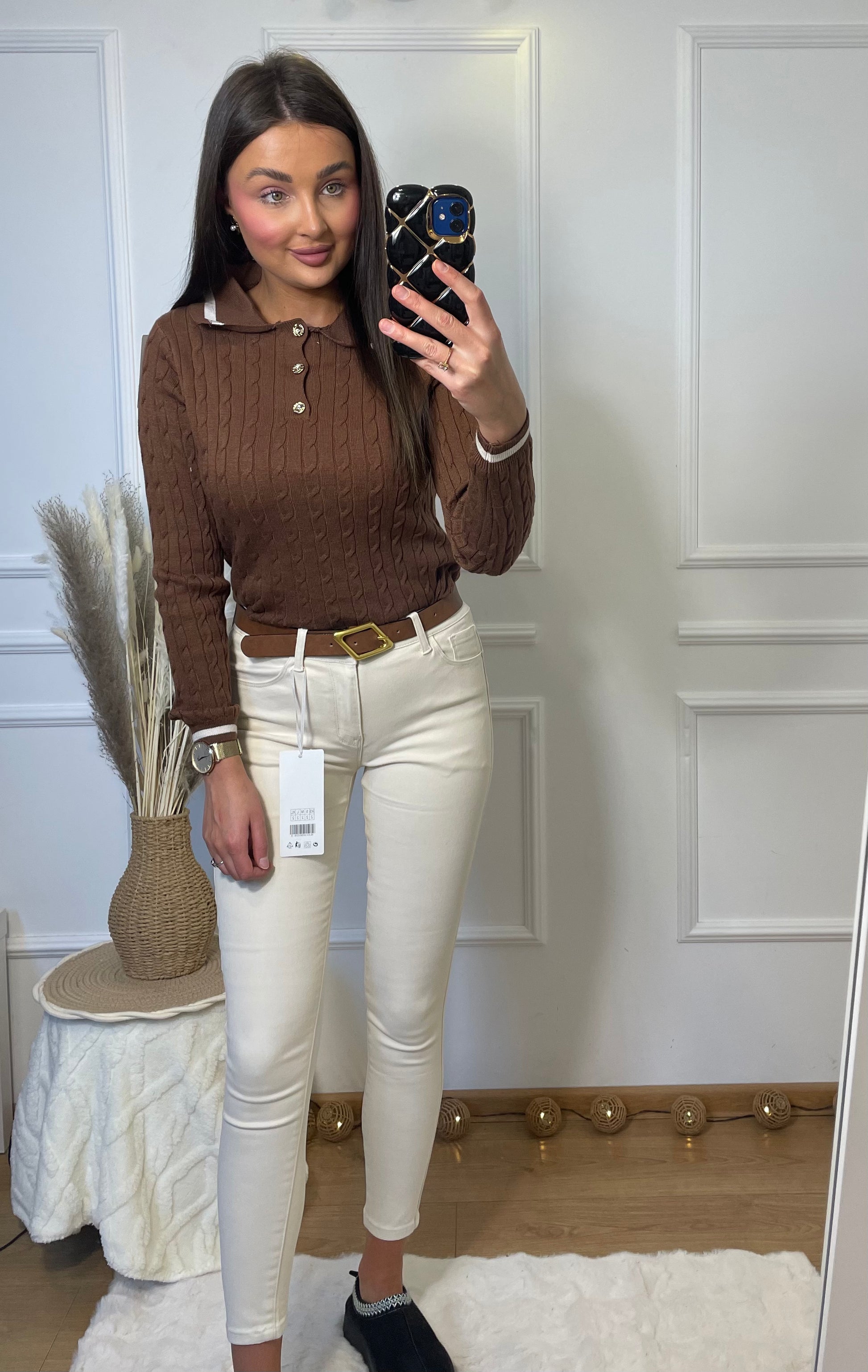 Ten elegancki sweterek z kołnierzykiem to połączenie klasy i wygody. Wykonany z miękkiej, elastycznej dzianiny, doskonale dopasowuje się do sylwetki i zapewnia komfort noszenia przez cały dzień. Delikatny kołnierzyk dodaje mu subtelnego uroku i sprawia, że świetnie sprawdzi się zarówno w codziennych, jak i bardziej formalnych stylizacjach. Idealny do spodni z wysokim stanem, klasycznych jeansów czy spódnicy — tworzy ponadczasowy, kobiecy look